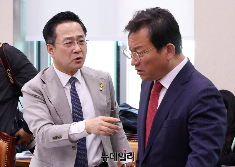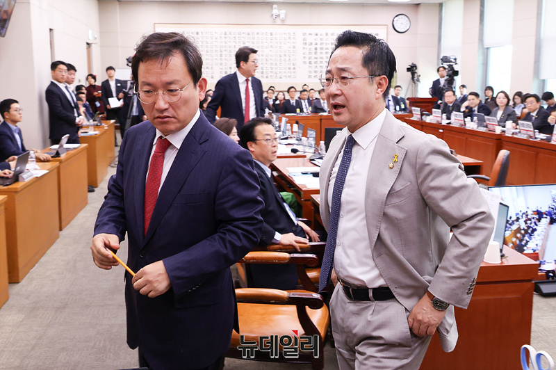 김형동 국민의힘 의원과 박성준 더불어민주당 의원이 16일 오후 국회에서 열린 윤석열 정권 정치검찰 조작기소 의혹 사건 진상규명 국정조사특별위원회에서 간사간 합의를 위해 회의장을 나서고 있다.