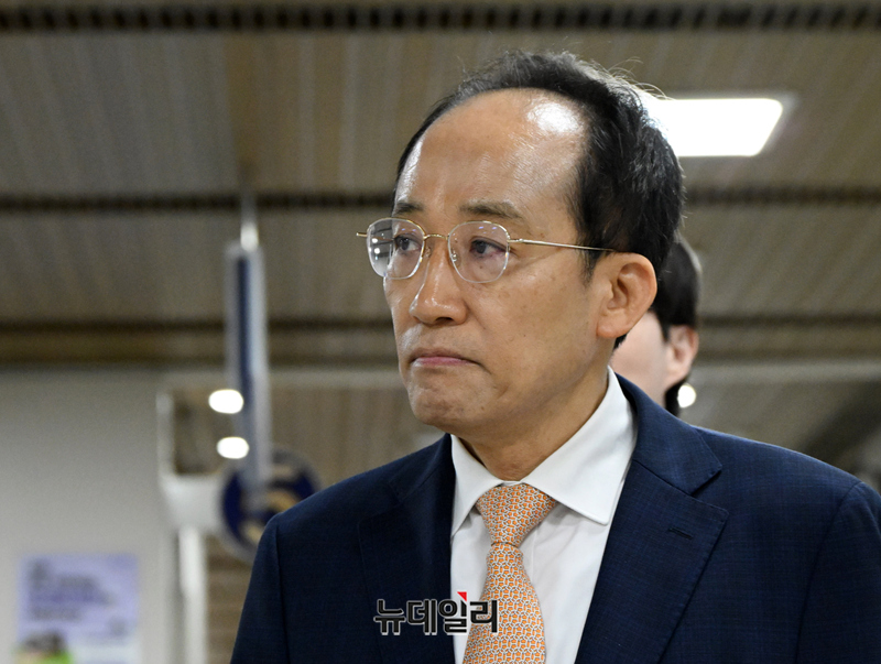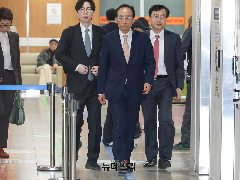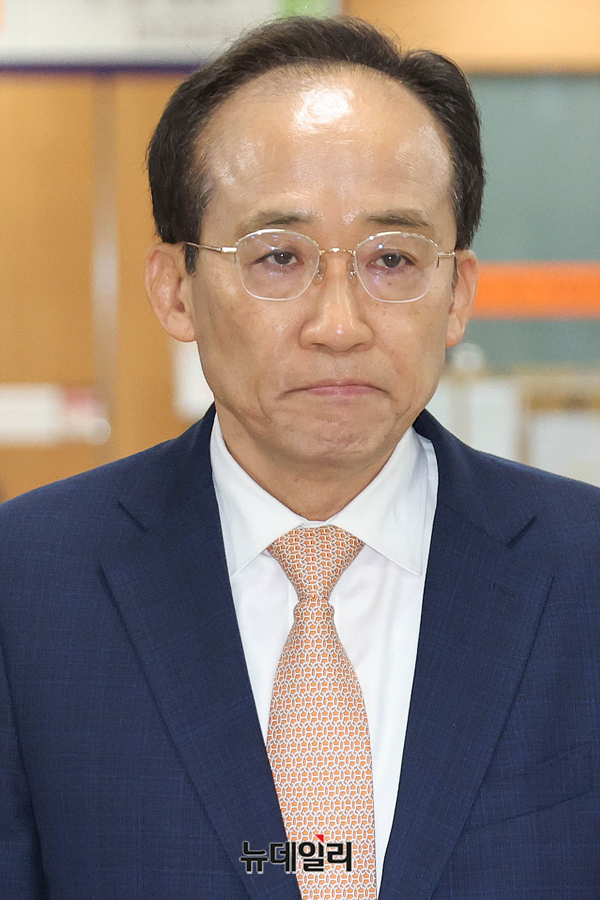 추경호 국민의힘 전 원내대표가 17일 오전 서울 서초구 서울중앙지방법원에서 열린 계엄 해제 표결 방해 혐의 관련 공판에 출석하고 있다.