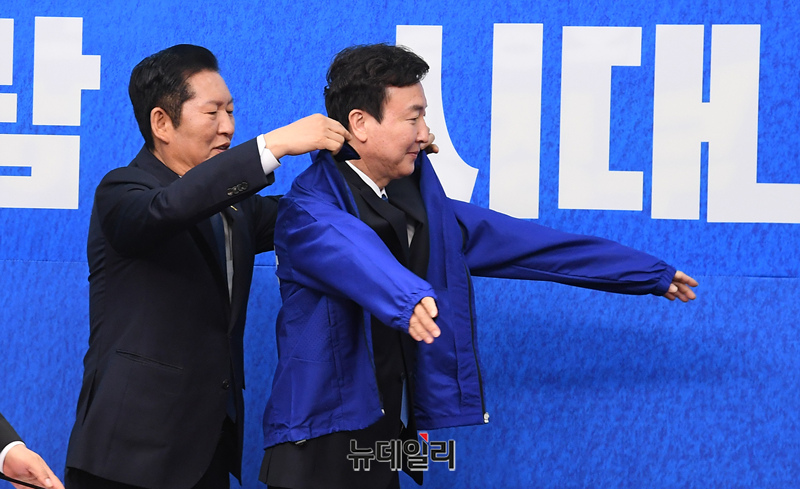 정청래 더불어민주당 대표가 17일 국회에서 열린 더불어민주당 인재영입식에서 1호 인재인 전태진 변호사에게 당 점퍼를 입혀 주고 있다.