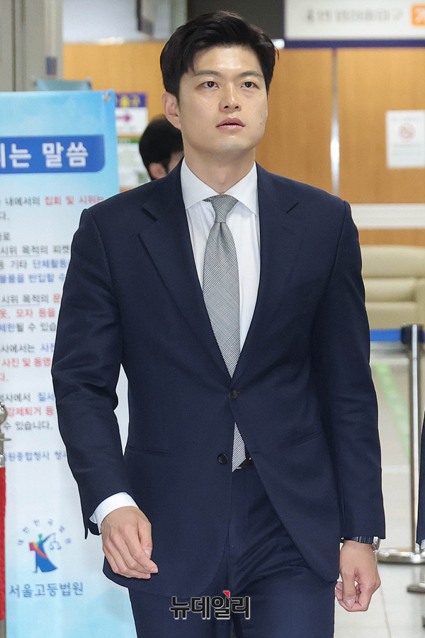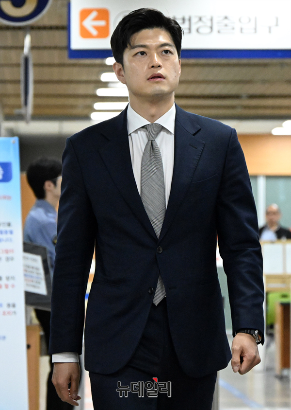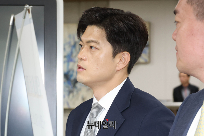 김용태 국민의힘 전 비대위원장이 17일 오전 서울 서초구 서울중앙지방법원에서 열린 계엄 해제 표결 방해 혐의 관련 공판에 증인으로 출석하고 있다.