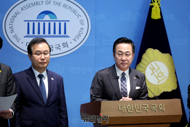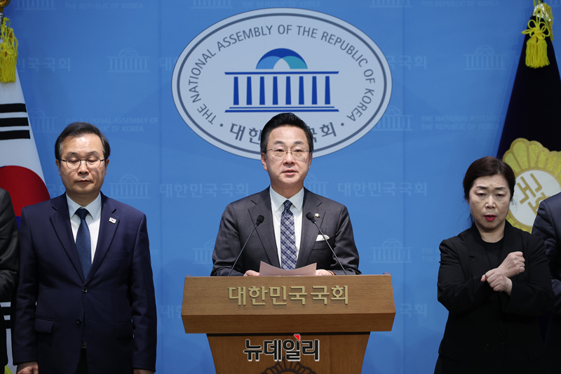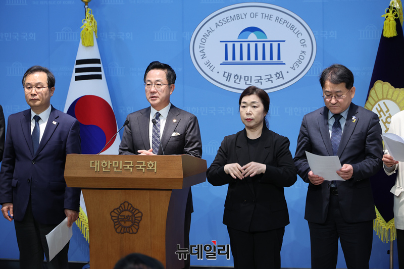 더불어민주당과 조국혁신당, 진보당 등 범여권 '윤석열 정권 정치검찰 조작기소 의혹 국정조사 특별위원회' 위원들이 17일 국회 소통관에서 남욱 씨의 증언 내용과 대장동 수사 관련 증언 등과 관련해 기자회견을 열고 있다.