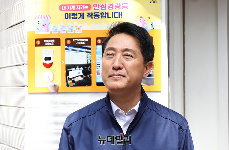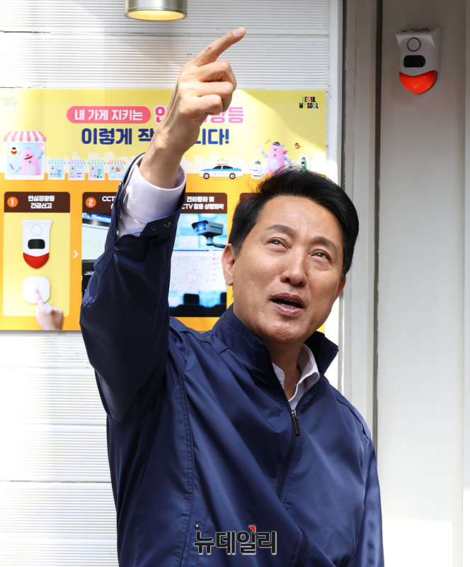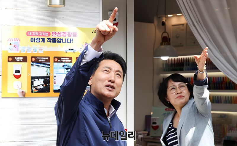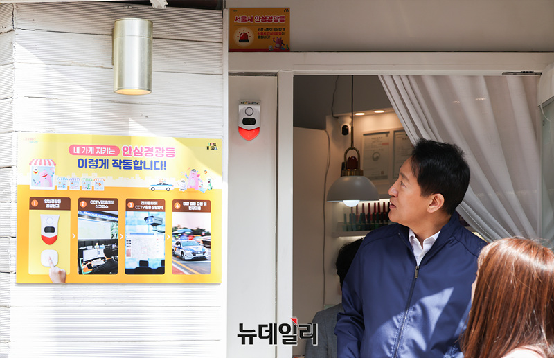 오세훈 서울시장이 17일 오후 서울 관악구 관악뷰티거리 골목상권 민생현장방문에서 안심경광등을 점검하고 있다.