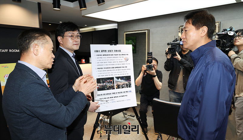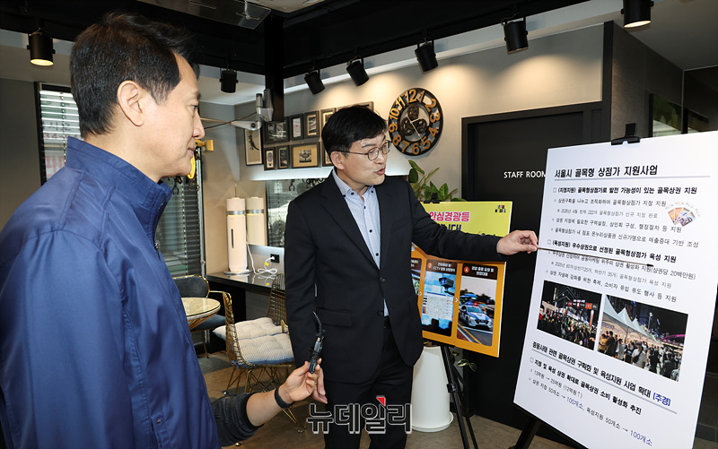 오세훈 서울시장이 17일 오후 서울 관악구 관악뷰티거리 골목상권 민생현장방문에서 관계자의 설명을 듣고 있다.