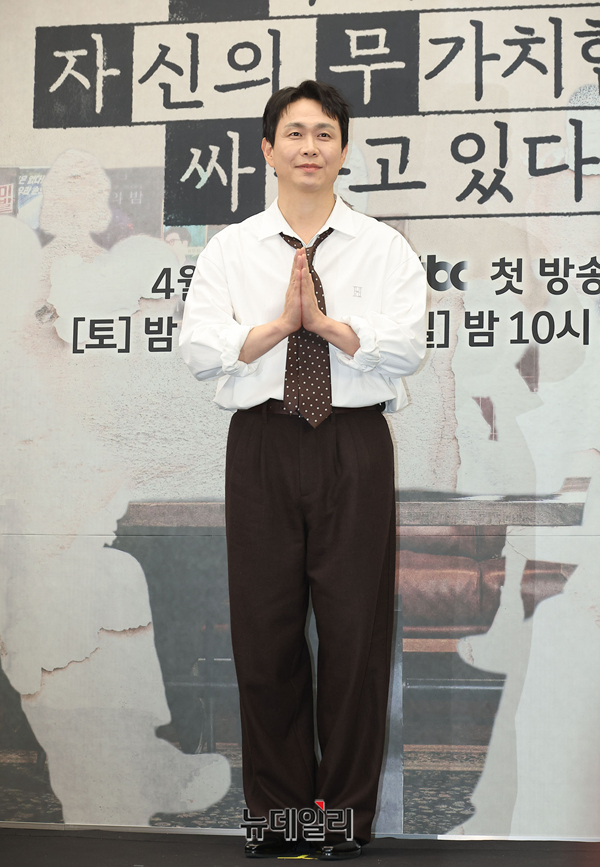 배우 오정세가 17일 오후 서울 마포구 스탠포드호텔에서 열린 JTBC 새토일드라마 '모두가 자신의 무가치함과 싸우고 있다(연출 차영훈, 극본 박해영)' 제작발표회에서 포즈를 취하고 있다.드라마는 '우리는 왜 절대 사라지지 않을 것처럼 이렇게 힘들게 살고 있는 걸까?'라는 근원적인 질문에서 시작해 '당신은 이미 충분히 가치 있다'는 응원의 메시지를 전하는 드라마.배우 구교환, 고윤정, 오정세, 강말금, 박해준, 한선화 등이 출연한다. 18일 첫 방송으로 매주 토, 일 밤 방송된다.