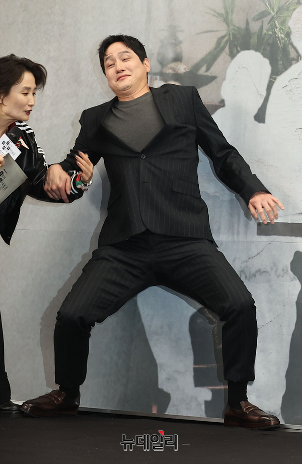 배우 박해준이 17일 오후 서울 마포구 스탠포드호텔에서 열린 JTBC 새토일드라마 '모두가 자신의 무가치함과 싸우고 있다(연출 차영훈, 극본 박해영)' 제작발표회에서 포토타임을 진행한 가운데 앉는 포즈를 취하다 넘어지려 하자 사회를 보던 박경림이 팔을 잡고 있다.드라마는 '우리는 왜 절대 사라지지 않을 것처럼 이렇게 힘들게 살고 있는 걸까?'라는 근원적인 질문에서 시작해 '당신은 이미 충분히 가치 있다'는 응원의 메시지를 전하는 드라마.배우 구교환, 고윤정, 오정세, 강말금, 박해준, 한선화 등이 출연한다. 18일 첫 방송으로 매주 토, 일 밤 방송된다.