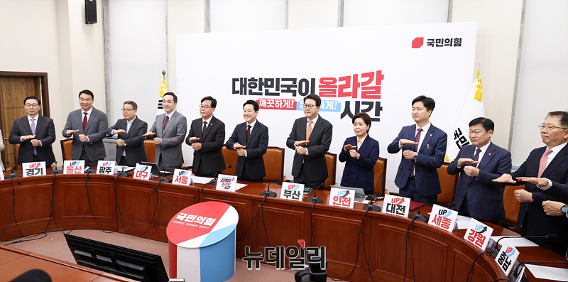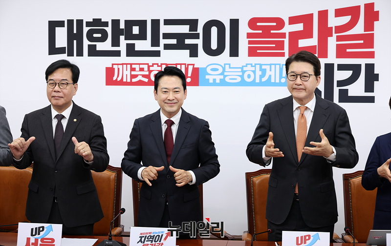 장동혁 국민의힘 대표를 비롯한 지도부가 20일 오전 서울 여의도 국회에서 열린 최고위원회의에서 장애인의 날을 맞아 수어로 인사하고 있다.