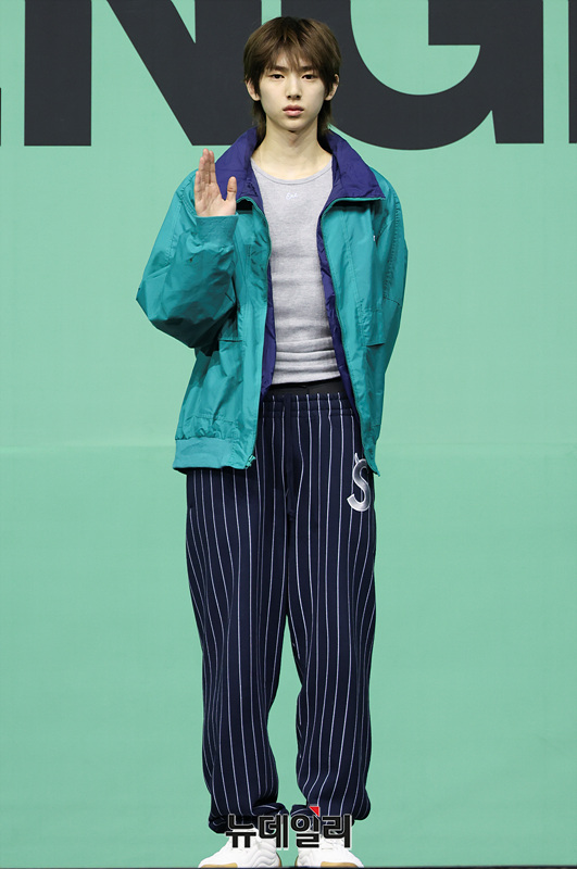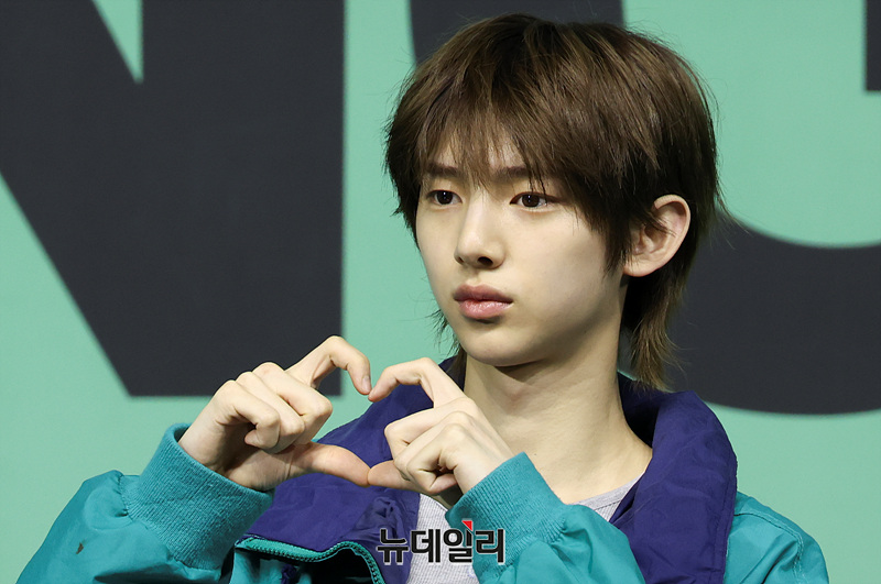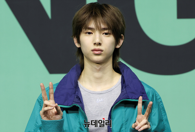 그룹 코르티스(CORTIS) 주훈이 20일 오후 서울 광진구 예스24 라이브홀에서 열린 미니 2집 '그린그린(GREENGREEN)'의 타이틀곡 '레드레드(REDRED)' 발표 기념 쇼케이스에서 포즈를 취하고 있다.