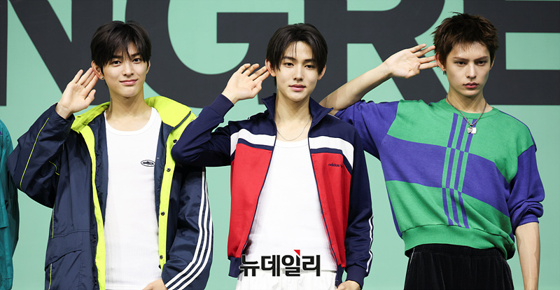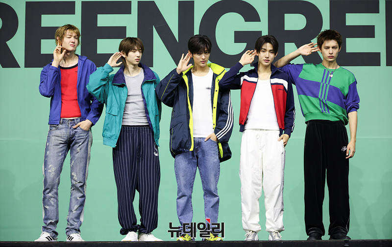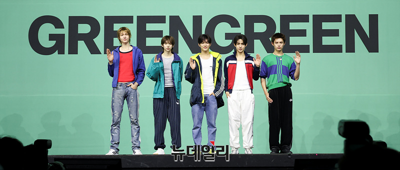 그룹 코르티스(CORTIS) 마틴, 주훈, 건호, 성현, 제임스가 20일 오후 서울 광진구 예스24 라이브홀에서 열린 미니 2집 '그린그린(GREENGREEN)'의 타이틀곡 '레드레드(REDRED)' 발표 기념 쇼케이스에서 포즈를 취하고 있다.