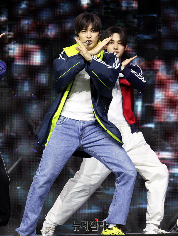 그룹 코르티스(CORTIS) 마틴, 주훈, 건호, 성현, 제임스가 20일 오후 서울 광진구 예스24 라이브홀에서 열린 미니 2집 '그린그린(GREENGREEN)'의 타이틀곡 '레드레드(REDRED)' 발표 기념 쇼케이스에서 무대를 선보이고 있다.