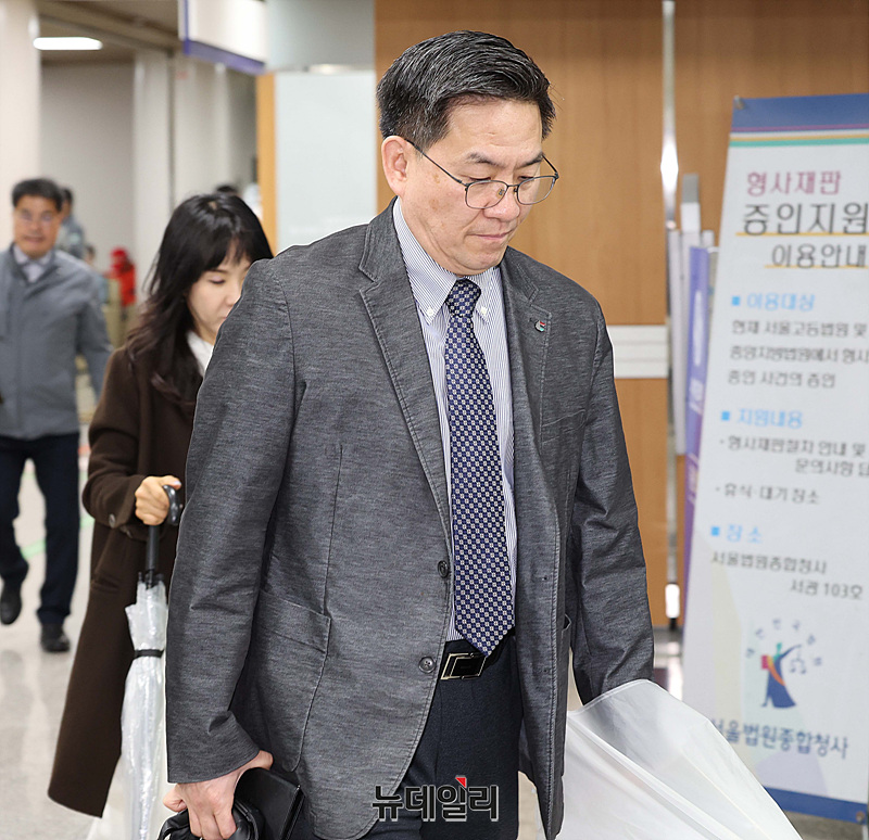 이진우 전 수도방위사령관이 20일 서울 서초구 서울중앙지법에서 열린 내란중요업무종사 등 혐의 공판에 출석하고 있다.