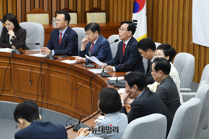 송언석 국민의힘 원내대표가 21일 오전 국회에서 열린 원내대책회의에서 모두발언을 하고 있다.