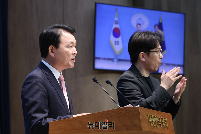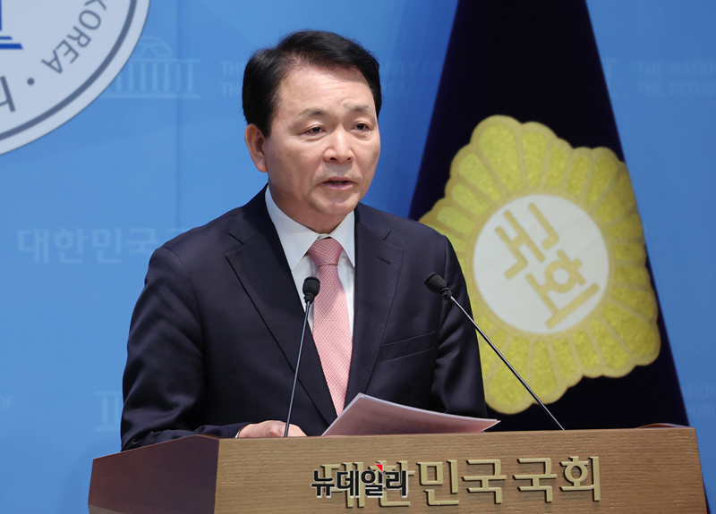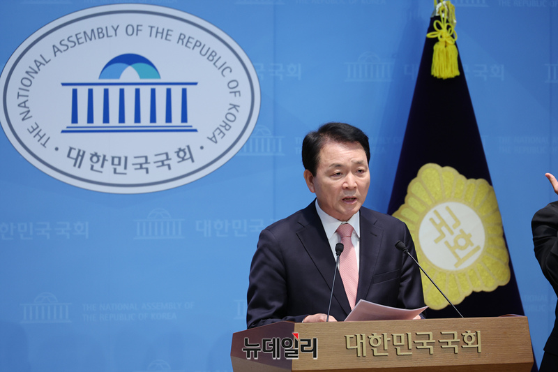 성일종 국회 국방위원회 위원장이 21일 오전 국회 소통관에서 정동영 통일부 장관의 대북 기밀 정보 유출 논란과 관련해 정동영 통일부 장관 사퇴를 촉구하고 있다.