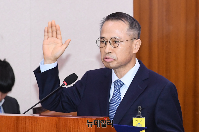 김규현 전 국정원장 및 청문회 증인들이 21일 오전 국회 '윤석열정권정치검찰조작기소의혹사건진상규명국정조사특별위원회'에서 열린 서해 공무원 피격·통계조작·윤석열 명예훼손 허위보도 조작기소 의혹 사건 청문회에서 증인 선서를 하고 있다.