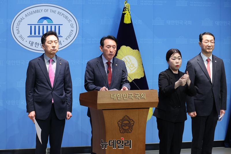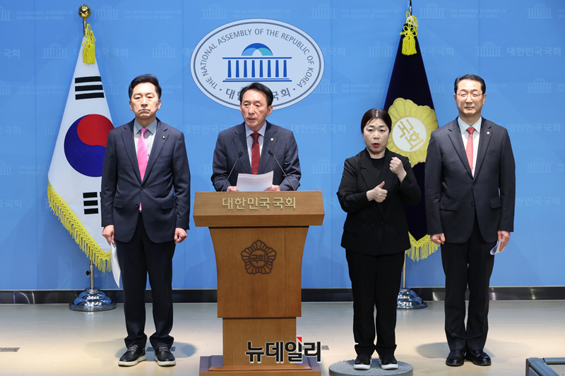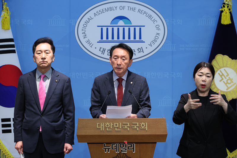 김석기 국회 외교통일위원회 위원장이 22일 국회 소통관에서 정동영 통일부 장관의 이른바 '북한 구성 소재 핵시설' 언급 관련 기자회견을 갖고 있다.