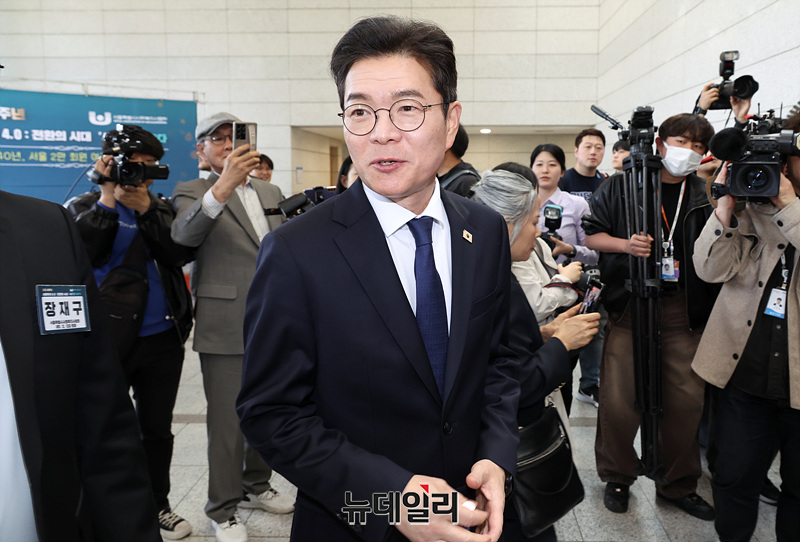 정원오 더불어민주당 서울시장 후보가 22일 오후 서울 용산구 백범 김구 기념관에서 열린 서울시 사회복지사협회 창립 40주년 행사에 참석하고 있다.