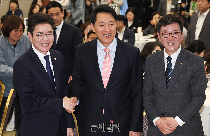 오세훈 서울시장과 정원오 더불어민주당 서울시장 후보가 22일 오후 서울 용산구 백범 김구 기념관에서 열린 서울시 사회복지사협회 창립 40주년 행사에서 기념촬영을 하고 있다.