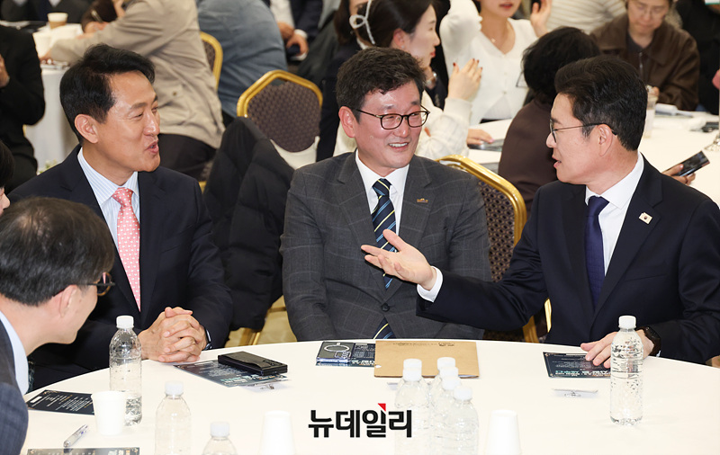 오세훈 서울시장과 곽경인 서울시사회복지사협회장, 정원오 더불어민주당 서울시장 후보가 22일 오후 서울 용산구 백범 김구 기념관에서 열린 서울시 사회복지사협회 창립 40주년 행사에서 대화를 나누고 있다.