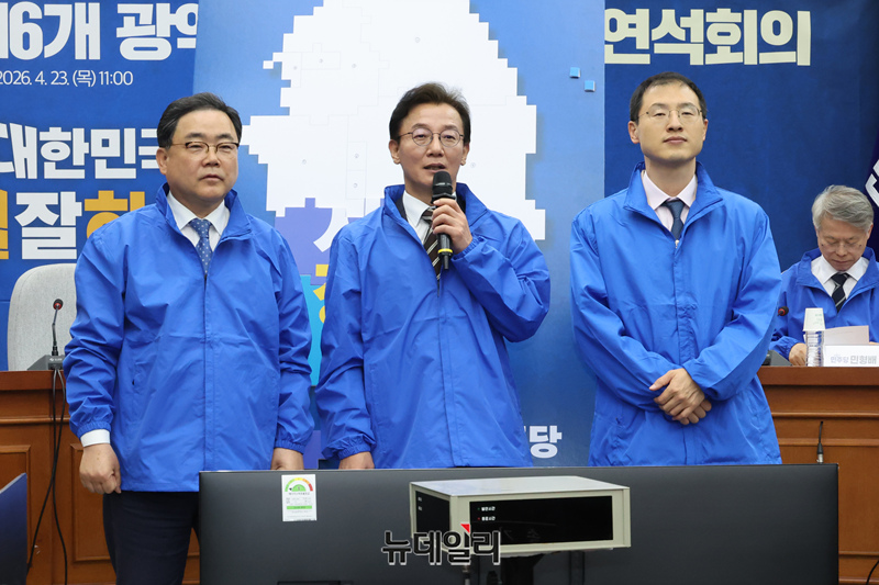 전재수 더불어민주당 부산시장 후보가 23일 국회에서 열린 '더불어민주당 16개 광역단체장 후보자 연석회의'에서 결의를 다지고 있다.