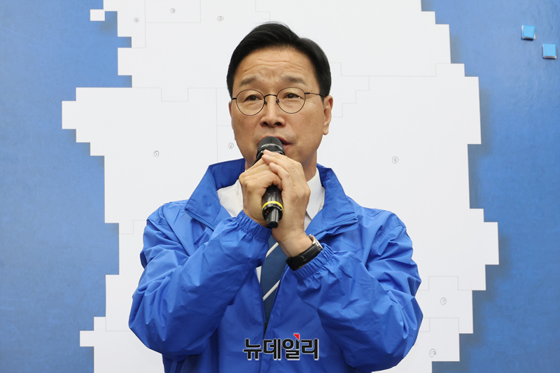 위성곤 더불어민주당 제주시장 후보가 23일 국회에서 열린 16개 광역단체장 후보자 연석회의에서 각오를 밝히고 있다.
