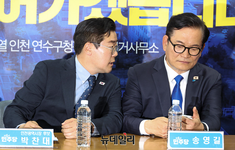 송영길 전 대표와 박찬대 인천시장 후보, 이언주 최고위원이 24일 오전 인천 연수구 정지열 연수구청장 후보 선거사무실에서 열린 더불어민주당 현장 최고위원회의에서 휴대전화를 보고 있다. (인천=서성진 기자)