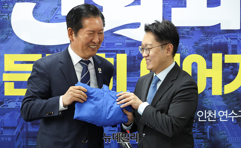 정청래 대표가 24일 오전 인천 연수구 정지열 연수구청장 후보 선거사무실에서 열린 더불어민주당 현장 최고위원회의에서 김남준 전 청와대 대변인에게 당 점퍼를 전달하며 기념촬영을 하고 있다. (인천=서성진 기자)