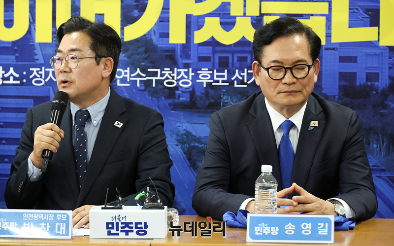박찬대 인천시장 후보가 24일 오전 인천 연수구 정지열 연수구청장 후보 선거사무실에서 열린 더불어민주당 현장 최고위원회의에서 발언을 하고 있다. (인천=서성진 기자)