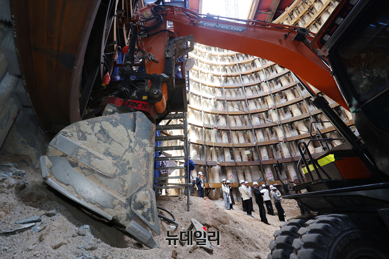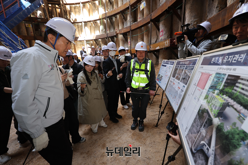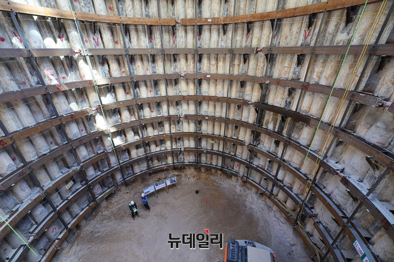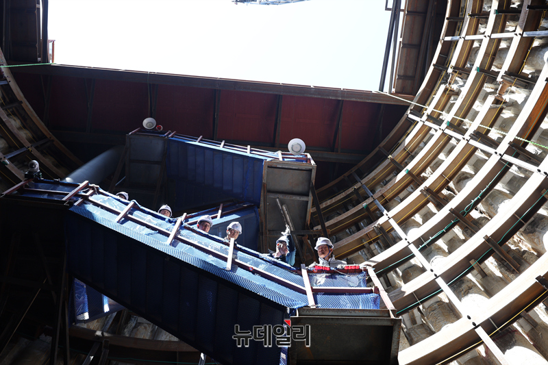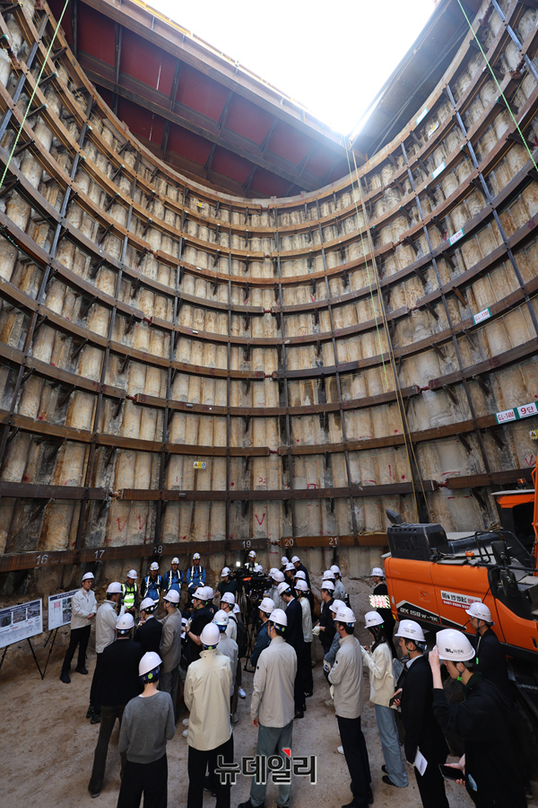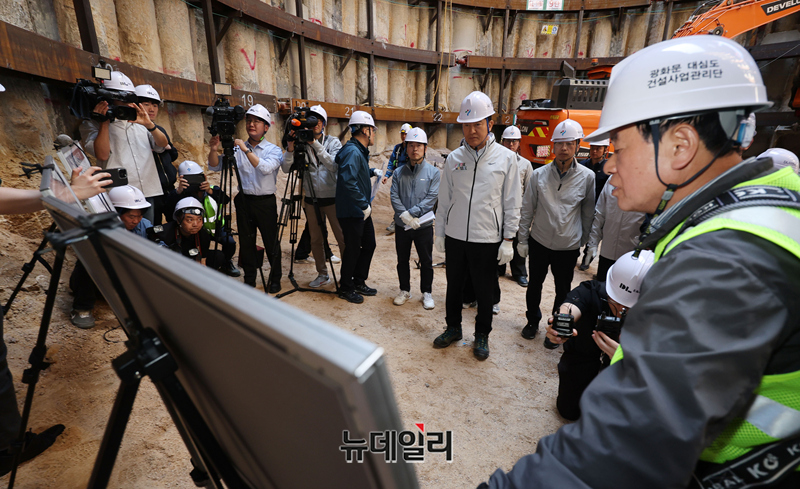 오세훈 서울시장이 24일 오전 서울 종로구 광화문 대심도 빗물배수터널 지하 공사현장을 찾아 현장을 둘러보고 있다.