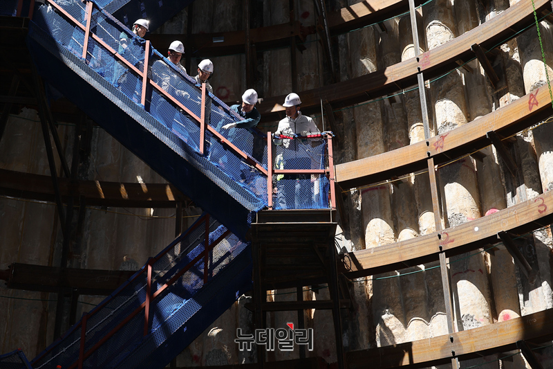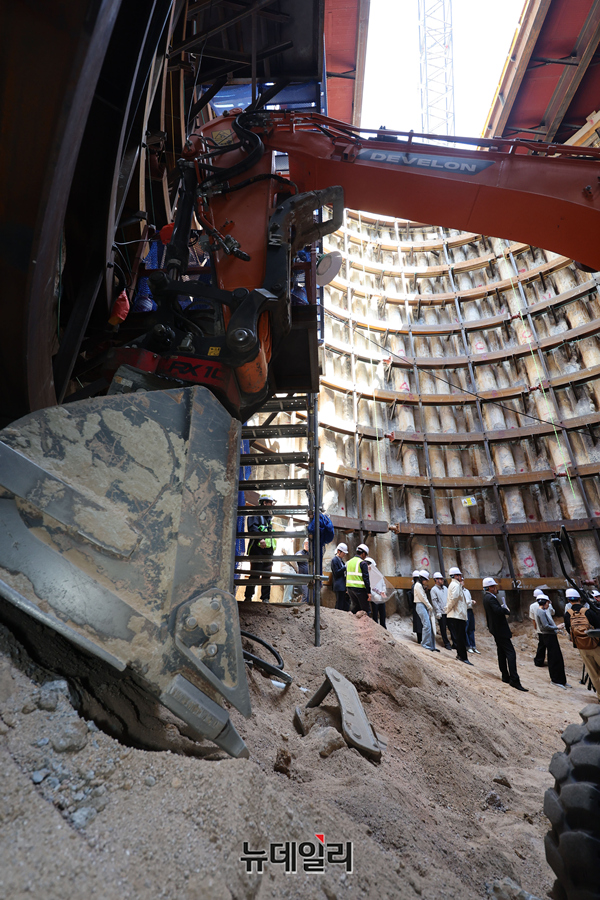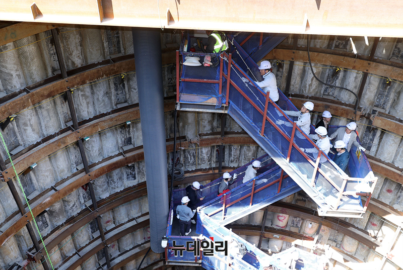오세훈 서울시장이 24일 오전 서울 종로구 광화문 대심도 빗물배수터널 지하 공사현장을 찾아 현장을 둘러보고 있다.