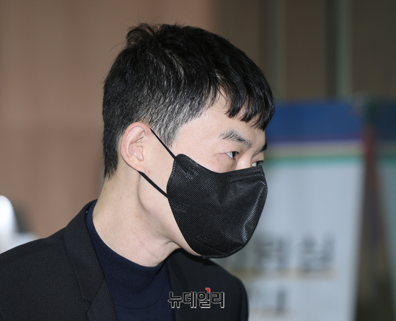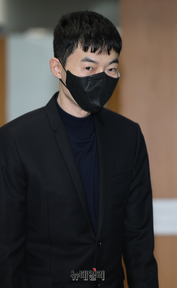수능 모의고사 문항 거래 혐의를 받는 수학강사 현우진이 24일 서울 서초구 서울중앙지방법원에서 열린 공판에 출석하고 있다.
