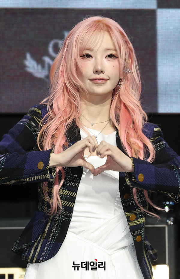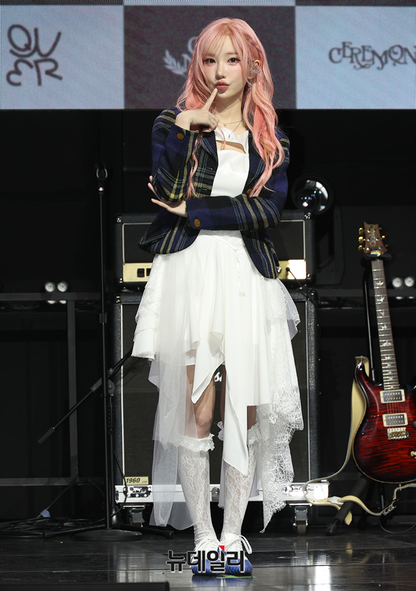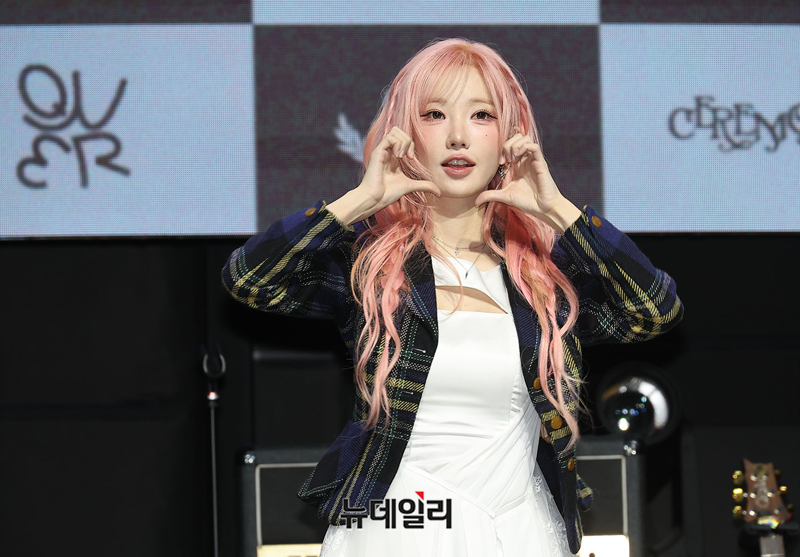 밴드 QWER 마젠타가 27일 오전 서울 서대문구 예스24 원더로크홀에서 열린 미니 4집 'CEREMONY' 발매 기념 미디어 쇼케이스에서 포즈를 취하고 있다.