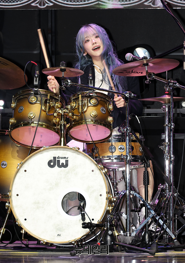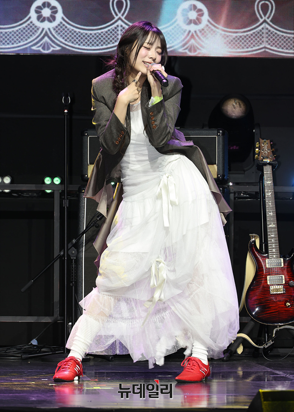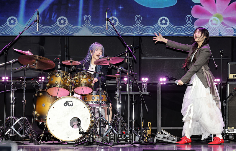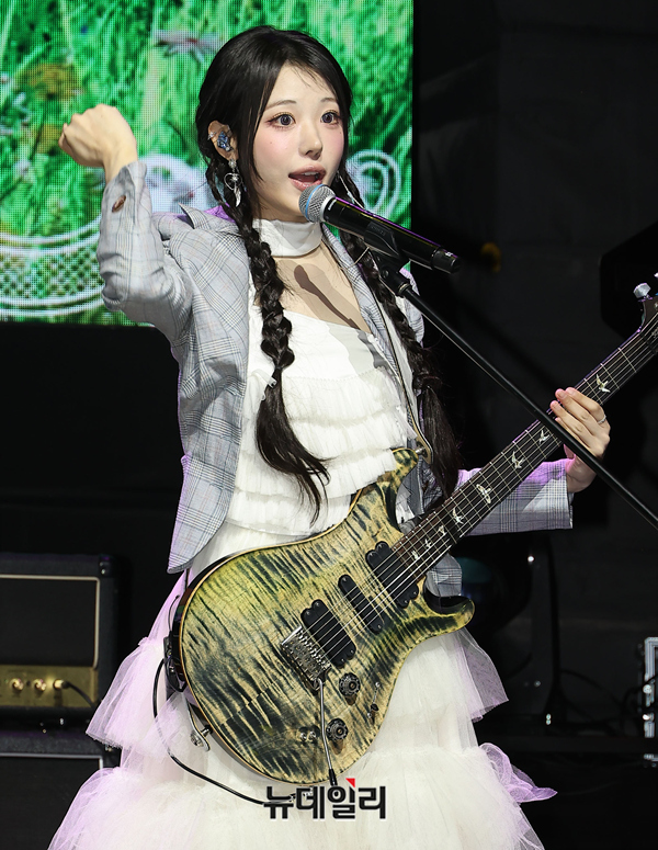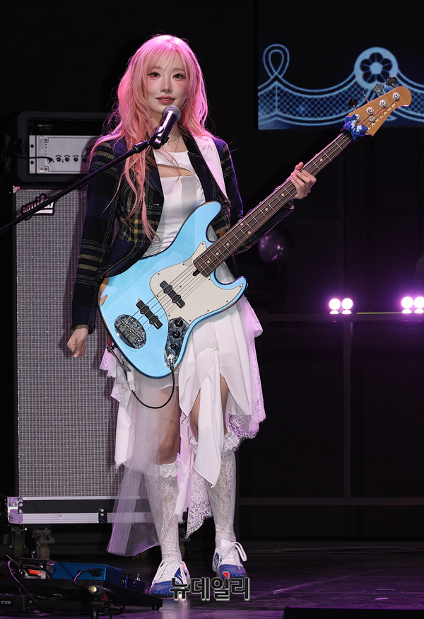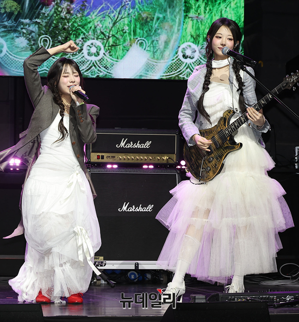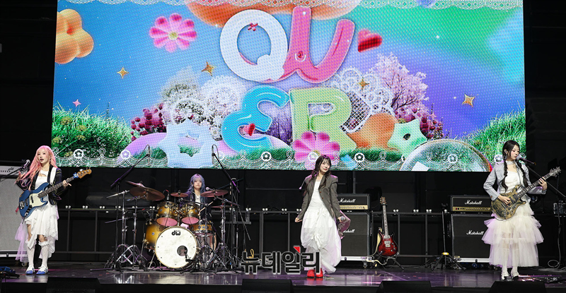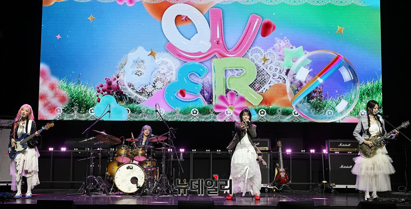 밴드 QWER가 27일 오전 서울 서대문구 예스24 원더로크홀에서 열린 미니 4집 'CEREMONY' 발매 기념 미디어 쇼케이스에서 타이틀곡 무대를 선보이고 있다.