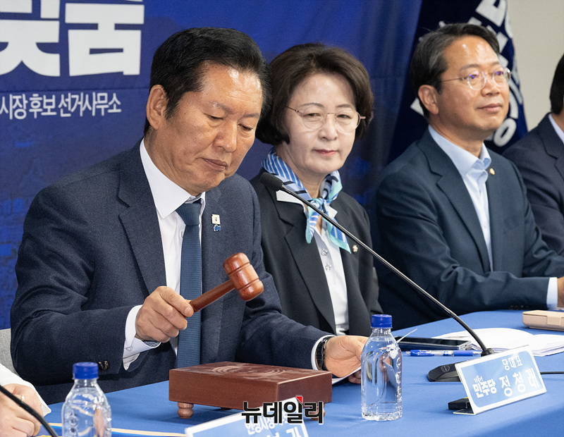 정청래 더불어민주당 대표가 27일 오전 경기 안성시 김보라 경기 안성시장 후보 선거사무소에서 열린 현장 최고위원회의에서 모두발언을 하고 있다.