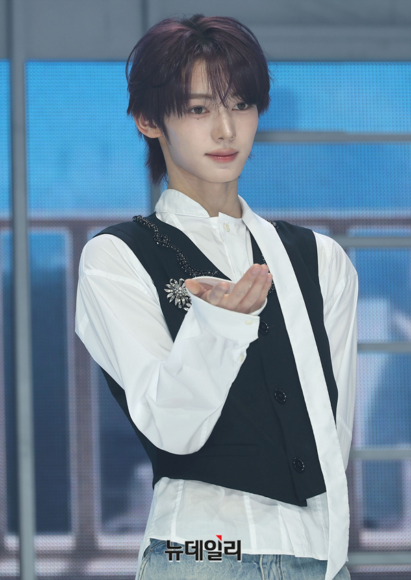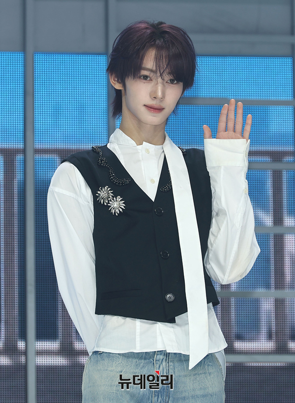 그룹 TWS(투어스) 한진이 27일 오후 서울 광진구 예스24 라이브홀에서 열린 미니 5집 'NO TRAGEDY(노 트래저디)' 쇼케이스에서 포즈를 취하고 있다.