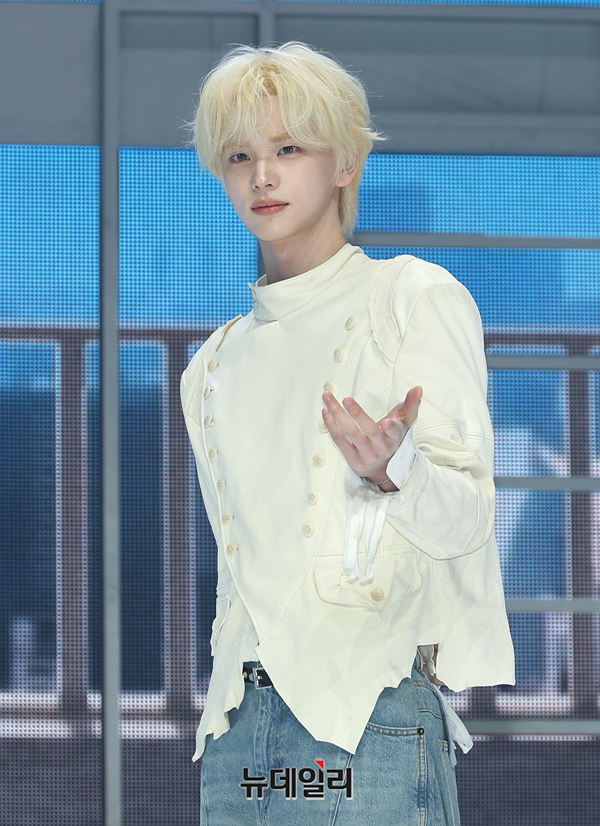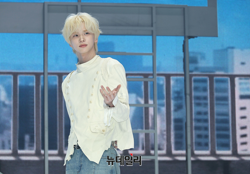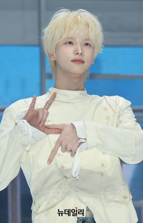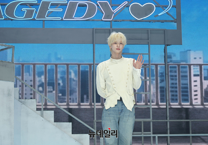 그룹 TWS(투어스) 신유가 27일 오후 서울 광진구 예스24 라이브홀에서 열린 미니 5집 'NO TRAGEDY(노 트래저디)' 쇼케이스에서 포즈를 취하고 있다.