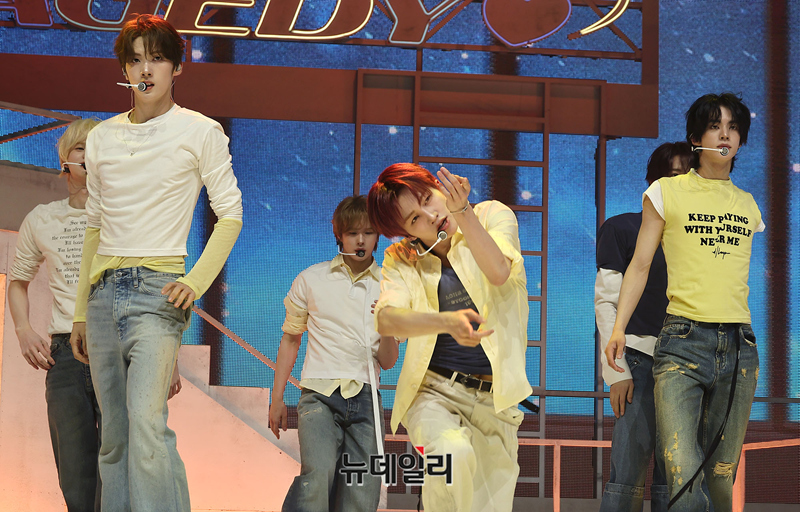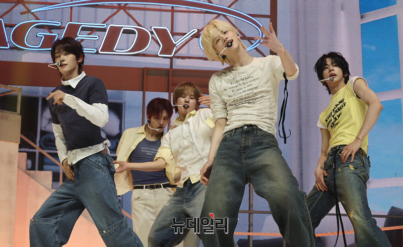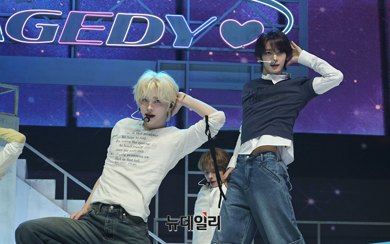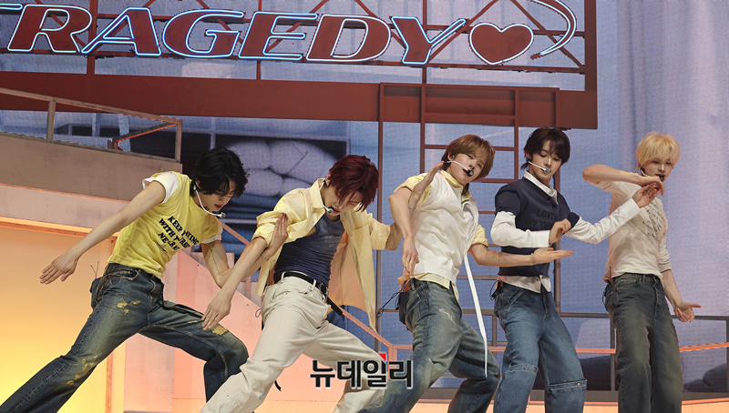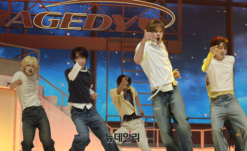 그룹 TWS(투어스)가 27일 오후 서울 광진구 예스24 라이브홀에서 열린 미니 5집 'NO TRAGEDY(노 트래저디)' 쇼케이스에서 수록곡 '너의 모든 가능성이 되어 줄게' 무대를 선보이고 있다.