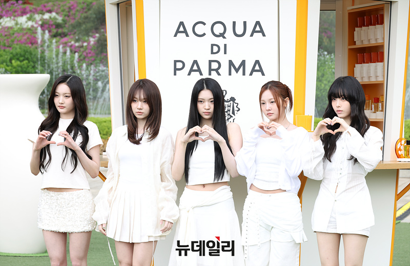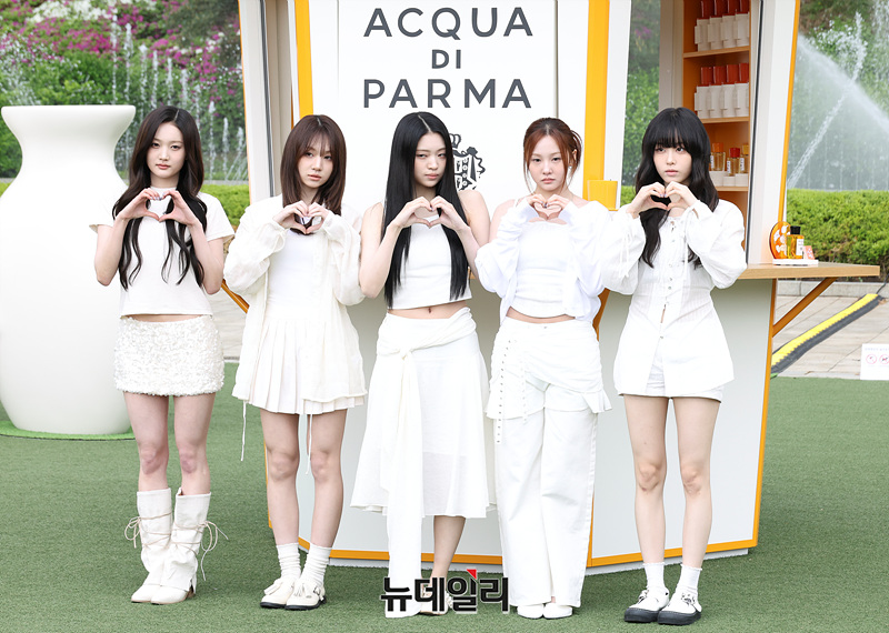 그룹 키비츠 유이, 지원, 예슬, 주원, 유나가 28일 오전 서울 서초구 예술의전당 음악광장에서 열린 아쿠아 디 파르마 팝업 스토어 오픈 기념 행사에서 포즈를 취하고 있다.