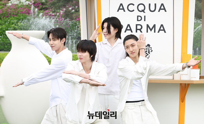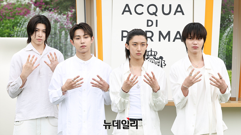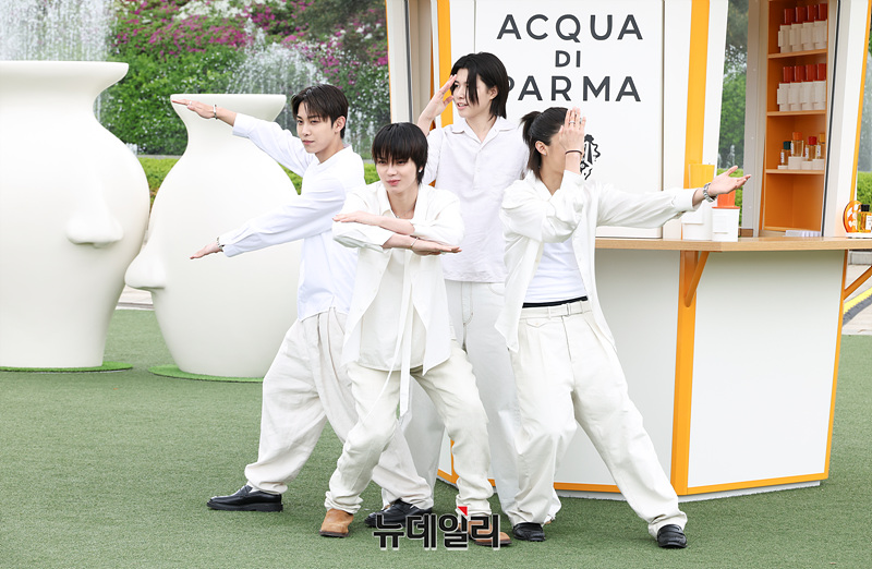 그룹 롱샷 루이, 률, 우진, 오율이 28일 오전 서울 서초구 예술의전당 음악광장에서 열린 아쿠아 디 파르마 팝업 스토어 오픈 기념 행사에서 포즈를 취하고 있다.