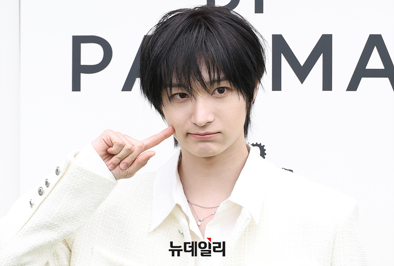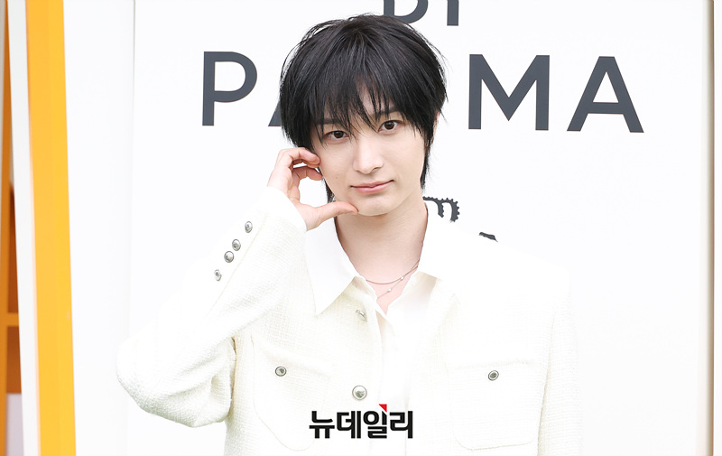 킥플립 동화가 28일 오전 서울 서초구 예술의전당 음악광장에서 열린 아쿠아 디 파르마 팝업 스토어 오픈 기념 행사에서 포즈를 취하고 있다.