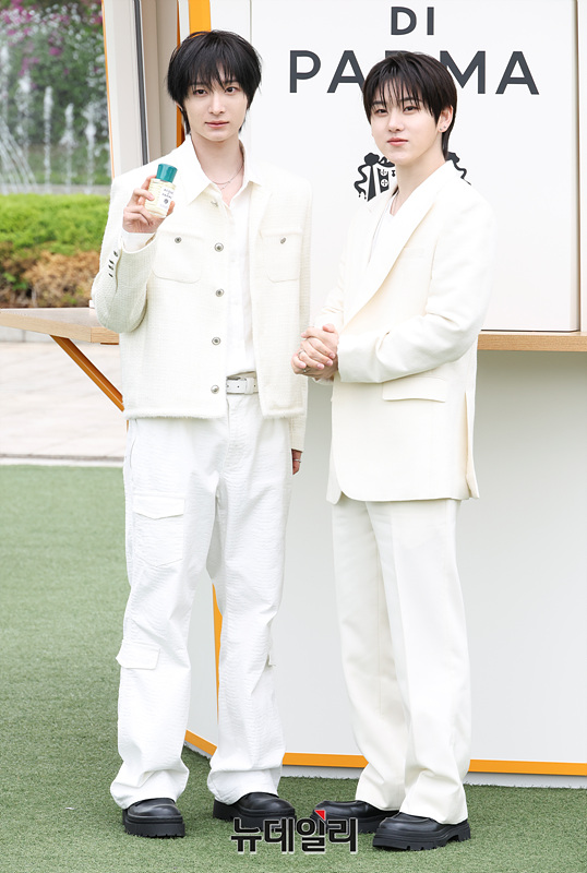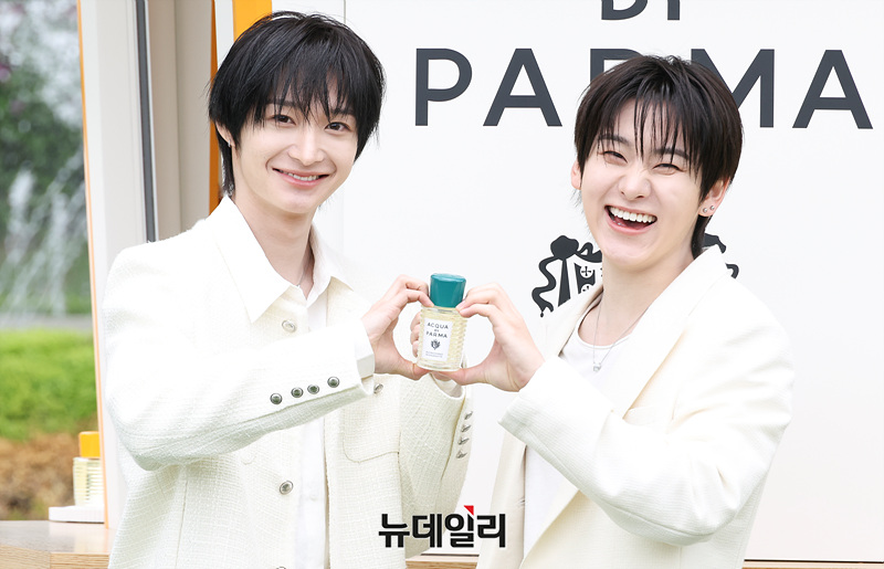 킥플립 동화와 계훈이 28일 오전 서울 서초구 예술의전당 음악광장에서 열린 아쿠아 디 파르마 팝업 스토어 오픈 기념 행사에서 포즈를 취하고 있다.