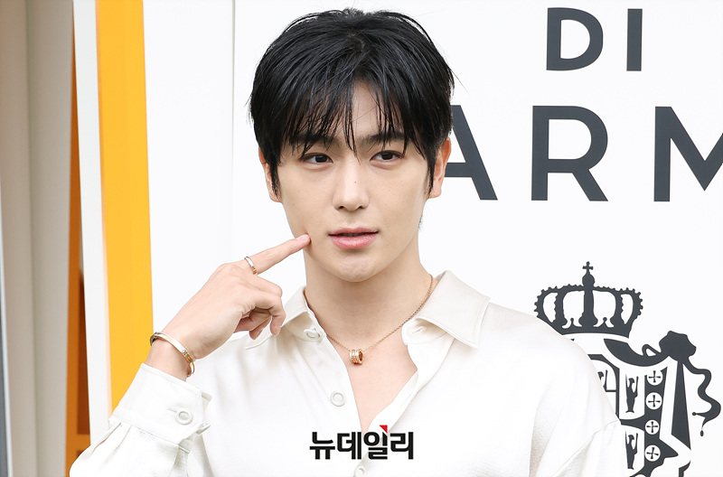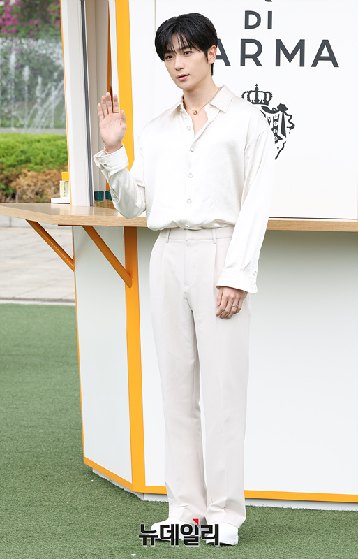 더보이즈 현재가 28일 오전 서울 서초구 예술의전당 음악광장에서 열린 아쿠아 디 파르마 팝업 스토어 오픈 기념 행사에서 포즈를 취하고 있다.
