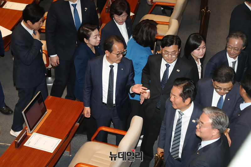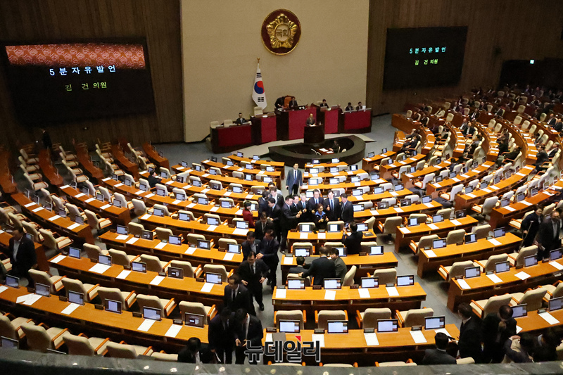 더불어민주당 의원들이 28일 오후 국회에서 열린 본회의에서 김건 국회 외교통일위원회 국민의힘 간사의 통일부장관(정동영) 해임건의안 관련 5분 자유발언이 시작되자 회의장을 떠나고 있다.
