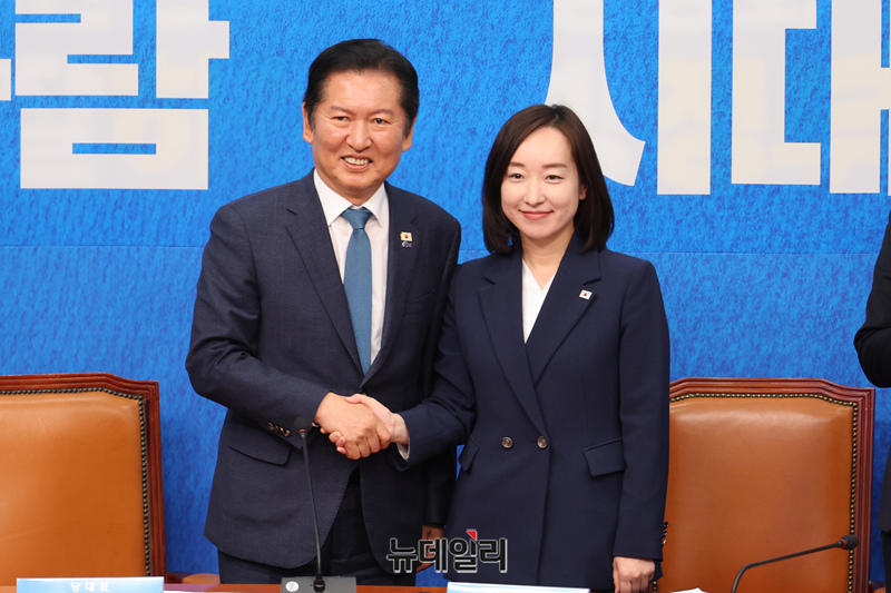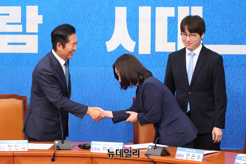 전은수 전 청와대 대변인이 29일 오전 국회에서 열린 더불어민주당 인재영입식에서 정청래 대표와 악수하고 있다.