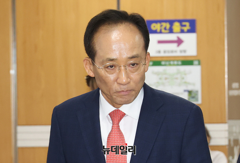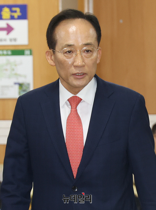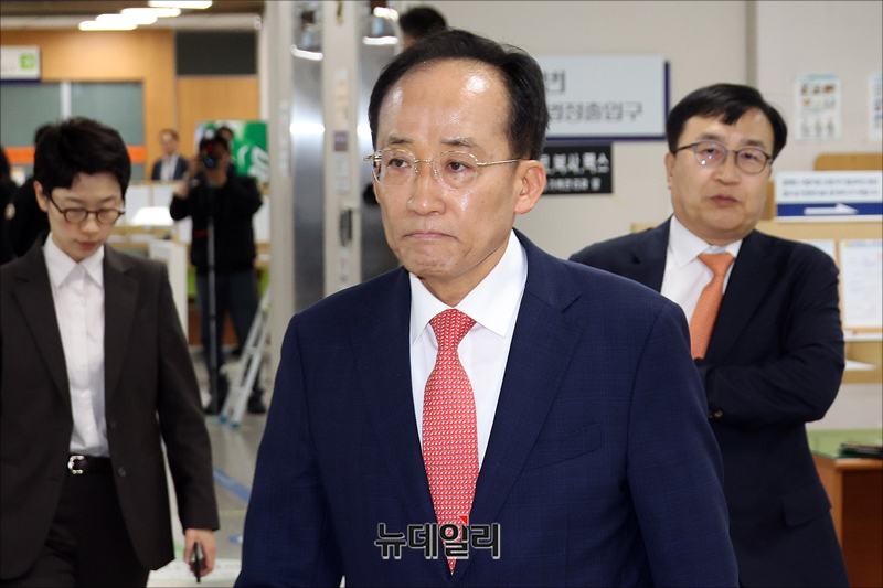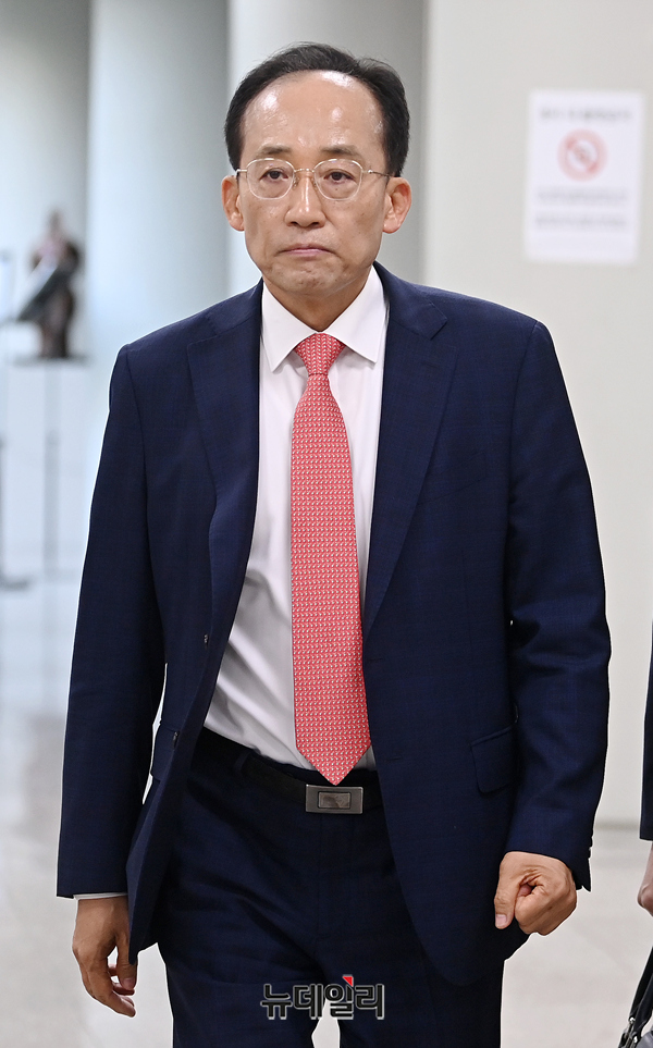 내란 중요 임무 종사 혐의를 받고 있는 추경호 국민의힘 전 원내대표가 29일 오후 서울 서초구 서울중앙지방법원에서 열린 공판에 출석하고 있다.