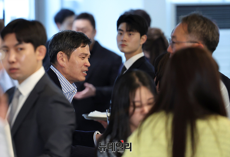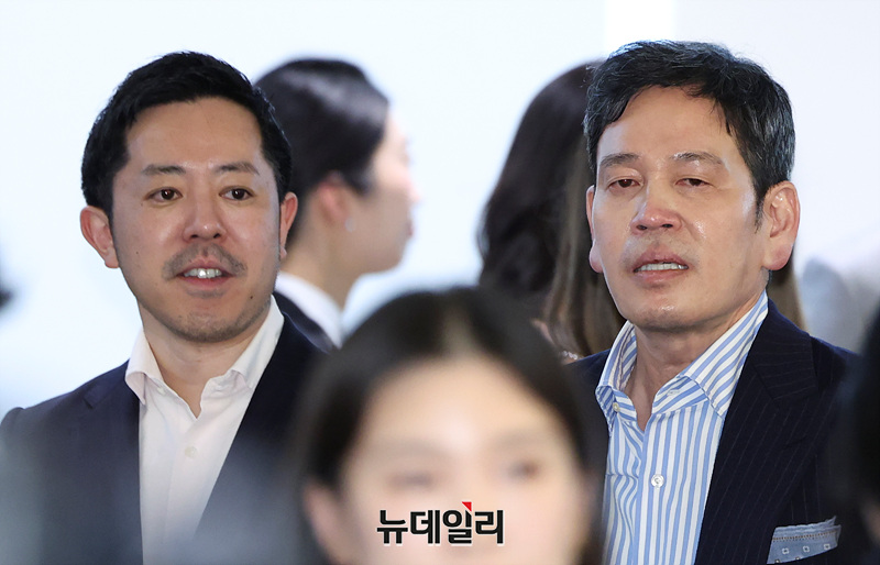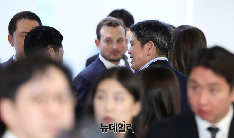 정용진 신세계그룹 회장이 29일 오후 서울 송파구 롯데콘서트홀에서 열린 부인 한지희 씨의 데뷔 앨범 발매 콘서트에서 손님들과 인사를 나누고 있다.