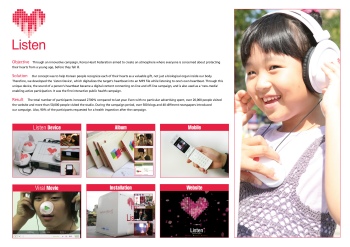 인쇄 광고 수상작 중에는 '나이키농구대회(Nike Basketball League)' 홍보를 위해 제작된 홍콩 맥켄 그룹(McCann Worldgroup Causeway Bay)의 '페이퍼배틀필드(Paper Battlefied·사진)'가 단연 돋보인다. 디자인 부문 대상작이기도 한 이 작품은 선수의 개인적인 스킬을 중시하는 농구대회 성격상, 개인간의 경쟁을 보여주기 위해 나이키 농구 리그 상위 10명의 선수가 엎치락 뒤치락 오버랩되면서 승부를 겨루고 있는 듯한 모습을 연작 포스터로 구성한 것이다. 제목 그대로 지면상에서 선수들이 접전을 펼치고 있는 이 포스터는 선수들이 실제 제작에도 참여해 화제를 모은 바 있다. 이 외에도 올해 해외 유수 광고제에서 여러 번 수상해 주목을 끈 국내대행사 ‘크리에이티비아(Creativia)’의 ‘리슨’(Listen·사진) 캠페인과 한국인이 설립·운영하는 다국적회사 '빅앤트 인터내셔널'의 '뿌린 대로 거두리라(What goes around comes around)' 포스터도 전시된다.