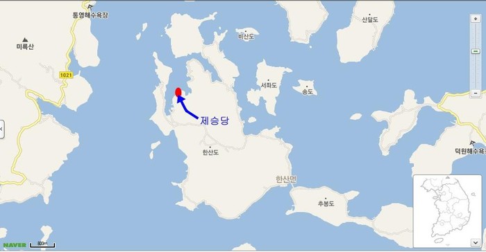 지도에서 처럼 제승당은 한산도의 북쪽에 자리잡고 있으며, 육지안으로 바다가 깊숙히 들어온 "만(灣)"에 자리잡고 있다.