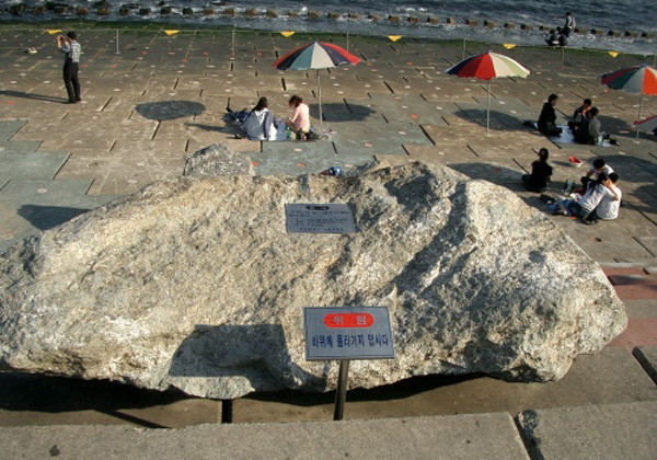 ▲ 태풍 '매미'에 휩쓸려 온 바위. 부산 광안리 해수욕장에 있다.