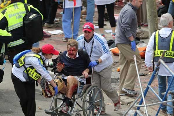 ▲ 휠체어에 실려 후송되는 보스턴 테러 부상자. 그 또한 다리를 부상당했다.