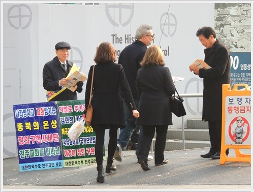우리와 함께 팸플릿을 나누어 주고 있는 광복회 이완성 회장