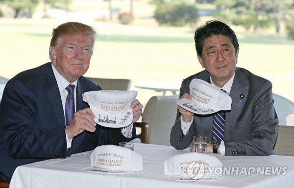 커플 모자에는 '동맹을 더 위대하게'라는 자수가 넣어져 있었다. 특히 아베 총리는 세계랭킹 4위의 일본인 프로골퍼 마쓰야마 히데키까지 대동하며 '트럼프 사로잡기'에 적극적인 모습을 보였다.